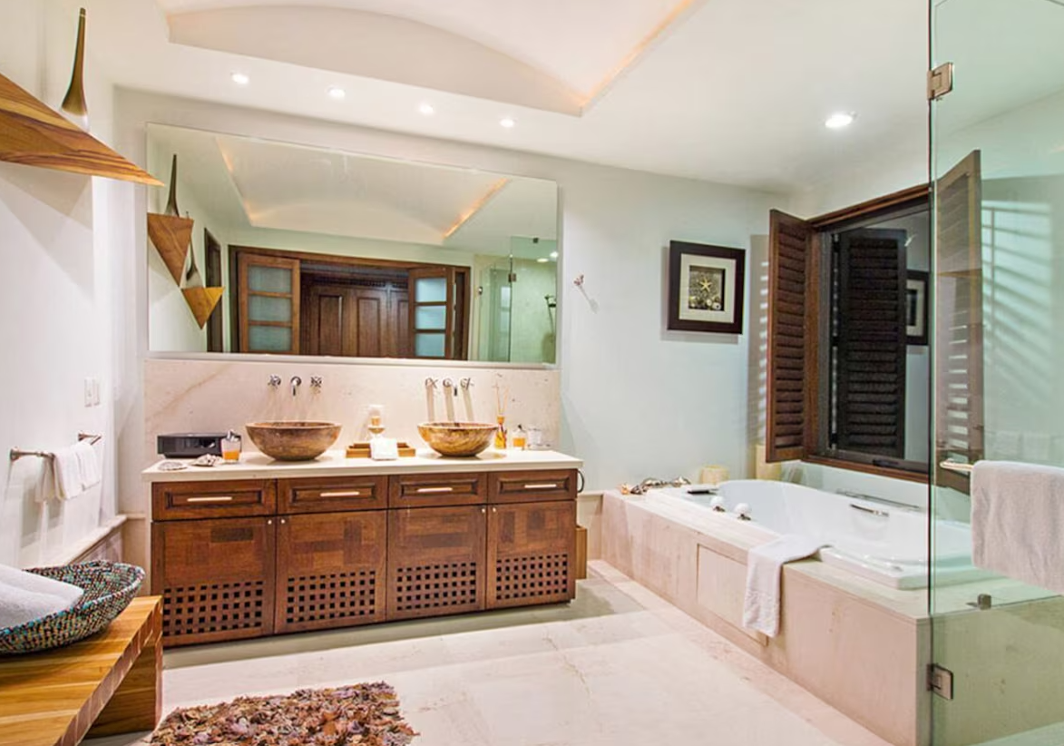 All three bedrooms at Beachfront Hacienda de Mita have en-suite bathrooms. The master suite has a king bed and jetted tub, the second bedroom has a queen bed and the third bedroom has two double beds. If you need extra space or are traveling with children, you’ll appreciate the additional bedroom with a bunk bed and its own bathroom.