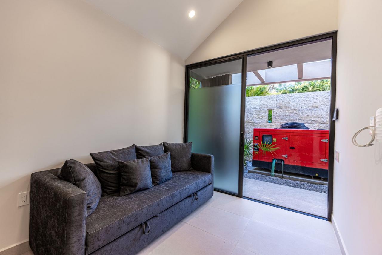 The living room, dining area, and kitchen offer adaptable living arrangements, which may be enclosed for a refreshingly cool, air-conditioned ambiance or opened to welcome the invigorating ocean breeze. With its soaring roofs and sophisticated design, the villa evokes the charm of a luxurious cabin while embracing the awe-inspiring splendor of the Pacific coastline.