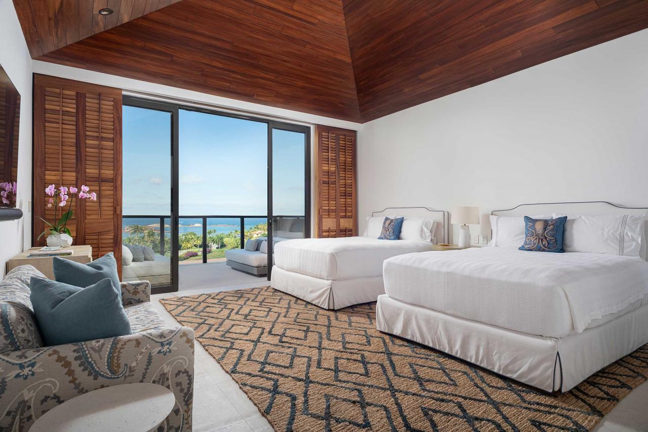 Bedroom 2: Two queen-size beds, desk, A/C, TV, WiFi, ocean view, terrace, and en-suite bathroom with bathtub, shower, double vanity.