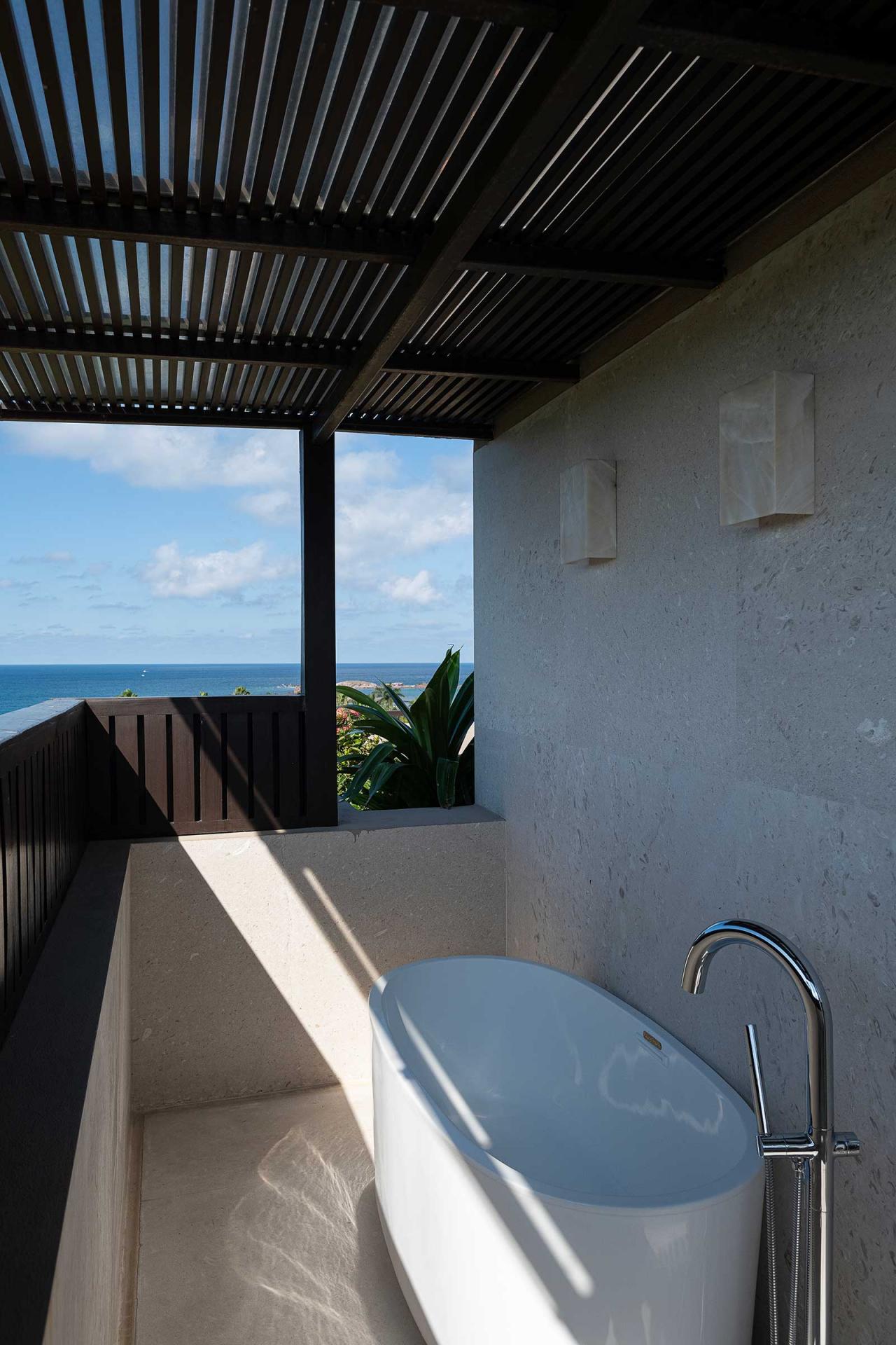 Primary Bedroom: King-size bed, desk, A/C, TV, WiFi, ocean view, terrace, and en-suite bathroom with bathtub, indoor/outdoor shower, double vanity.